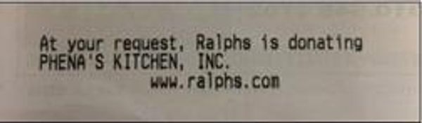 "At your request, Ralphs is donating to Phena's Kitchen, Inc.".